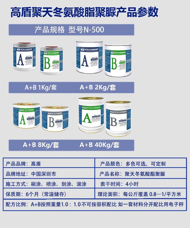 高盾天冬聚脲防腐涂料 N500,属于双组份反应型防腐防护材料,适用于钢结构、设备管道、金属表面及其他需要长期户外防护的基面。产品由 A 组份与 B 组份现场混合后反应成膜,可在金属表面形成连续致密的防护层,适合长期户外环境下的防腐与表面防护应用。你官网现有 N500 产品页已经将其表述为脂肪族结构、柔韧型、防水防腐隔热、户外不黄变的聚天门冬氨酸酯聚脲涂料。